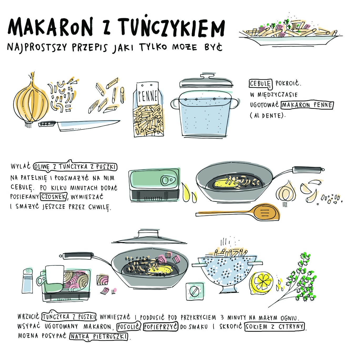 Wrzucić tuńczyka z puszki, wymieszać i poddusić pod przykryciem 3 minuty na małym ogniu. Wsypać ugotowany makaron. Posolić i popieprzyć do smaku i skropić sokiem z cytryny. Można posypać natką pietruszki.
