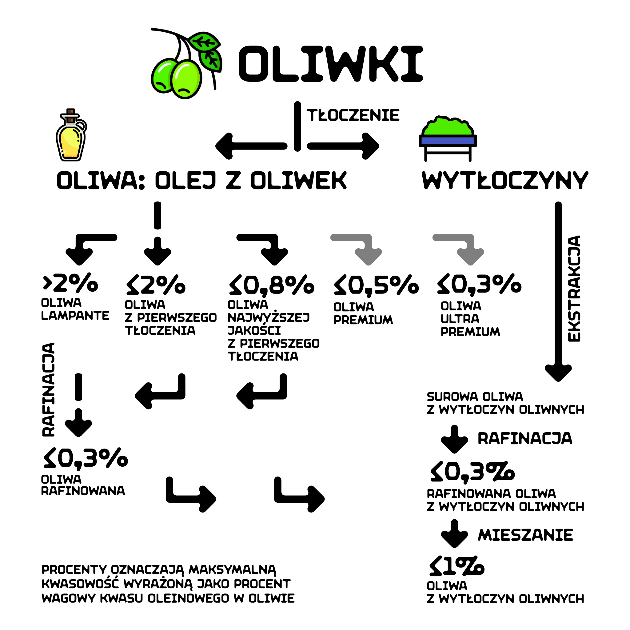 - »Ekstra oliwa z pierwszego tłoczenia« / »oliwa ekstra z pierwszego tłoczenia« / »oliwa najwyższej jakości z pierwszego tłoczenia« to oliwa z pierwszego tłoczenia, o maksymalnej kwasowości nie większej niż 0,8 g na 100 g.