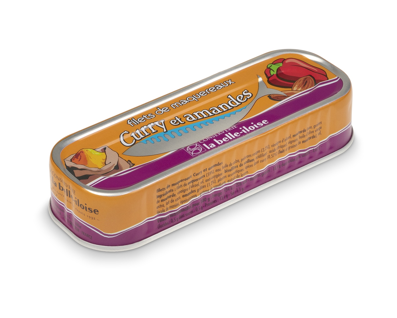 Skład: Filety z makreli (59%) [ryba], woda, olej rzepakowy, papryka czerwona (3,3%), ocet spirytusowy, musztarda (woda, gorczyca, ocet spirytusowy, sól), cebula, oliwa extra virgin, mleko kokosowe, prażone migdały (1,2%), sól, przyprawy w tym curry, (0,6%) (mleko), skrobia kukurydziana, zioła, czosnek, włókna roślinne (len, cytrusy), ekstrakt drożdżowy.