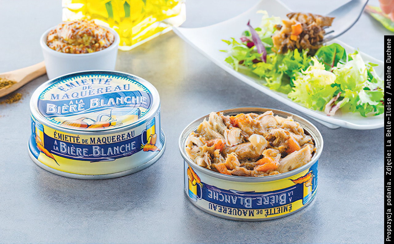 Skład: Filety z makreli (49%), olej rzepakowy, piwo pszeniczne (słód jęczmienny (gluten), słód pszeniczny (gluten), chmiel, kolendra, skórka pomarańczowa, drożdże) (10%), cebula (9%), marchew (5%), skrobia z manioku, proszek jabłkowy, prażona cebula, zioła, sól, nasiona gorczycy, seler, przyprawy.