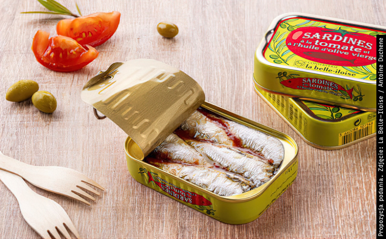 Skład: Sardynki (65%), woda, koncentrat pomidorowy (12%), oliwa extra virgin (5,3%), sól, ocet spirytusowy, zioła aromatyczne, przyprawy.