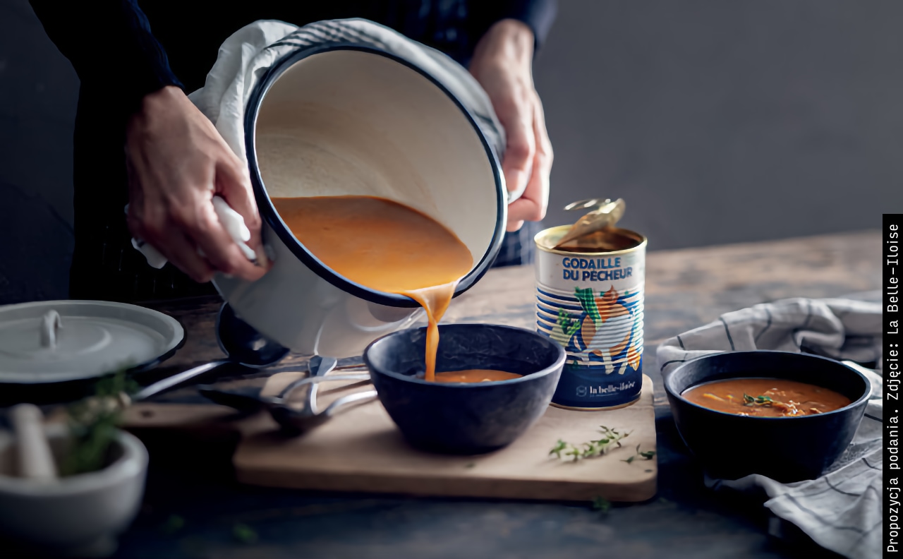 Skład: Woda, ryby (18%), w tym dorsz (8%), ziemniaki (11%), cebula (7%), koper włoski (4%), białe wino (siarczyny), krewetki, pory (2%), homar, oliwa extra virgin, koncentrat pomidorowy, zioła (0,6%), sól, skrobia ziemniaczana, ekstrakt drożdżowy, suszone algi, przyprawy.